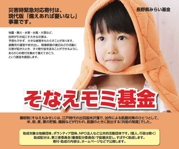 江戸時代の米沢藩で行われていた「備籾制(そなえもみせい)」は、凶作や飢饉に備えて米や籾、麦、粟などを蓄え、必要なときに放出する共助の制度でした。この歴史的な知恵を現代に活かし、長野県では「災害時緊急対応寄付」という新しい寄付制度を創設しました。これは、地震・噴火・台風・水害・大雪などの自然災害に対して、迅速に支援を届けるための基金です。