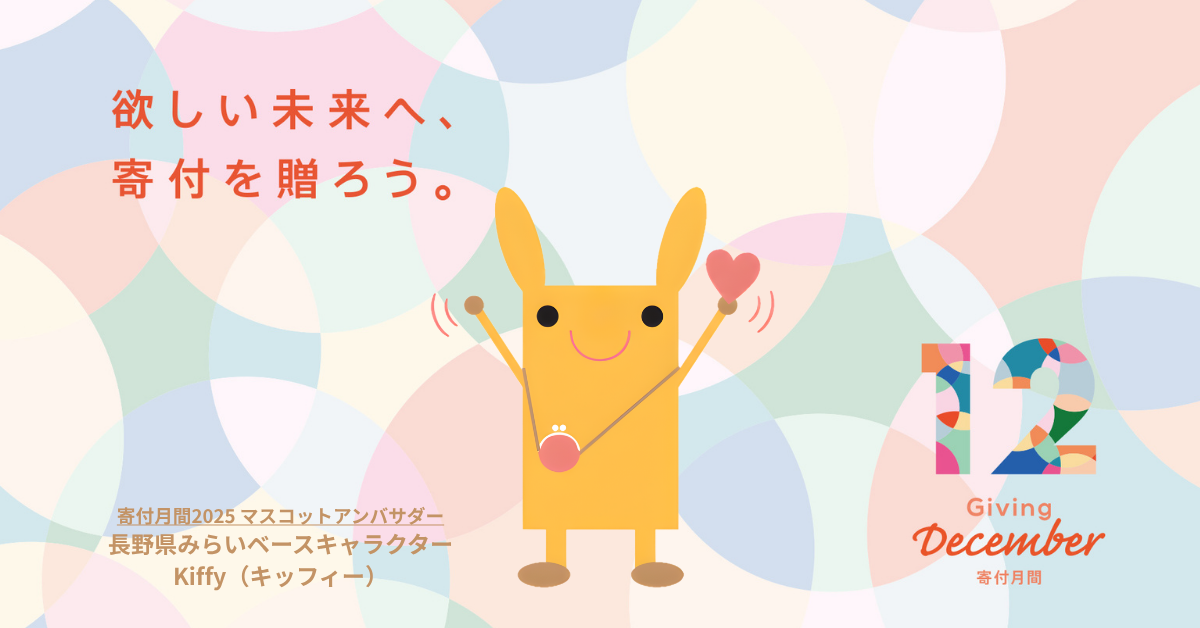 長野県みらいベースのキャラクターKiffy(キッフィー)が、この度、12月の「寄付月間 -Giving December-」を広めるマスコットアンバサダーに就任いたしました!